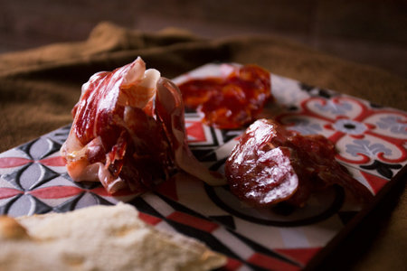 Selective foucs on ham jamon Bellota on wooden board