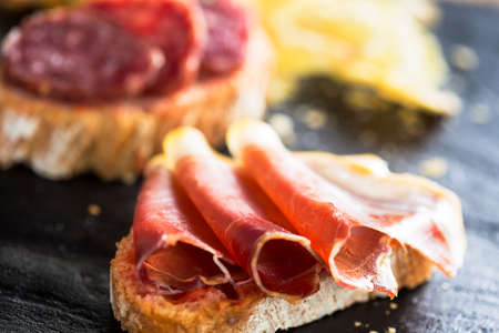 Typical spanish appetizer called pinchos with spanish ham and slice of bread.