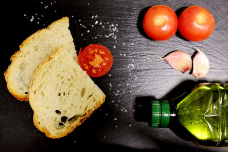 white homemade bread, tomatoes, garlic and a bottle of olive oil, salt in the Spanish style on a black background