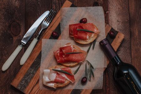 Toasts with ham serrano served on plate. Top view. Copy space.