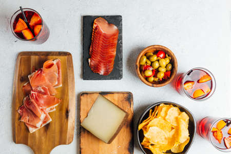 Spanish tapas and sangria on wooden table. Typical spanish tapas concept.