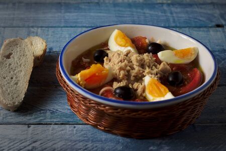 Potato salad with olives, tuna, boiled egg and its dressing. Delicious plate of Spanish food