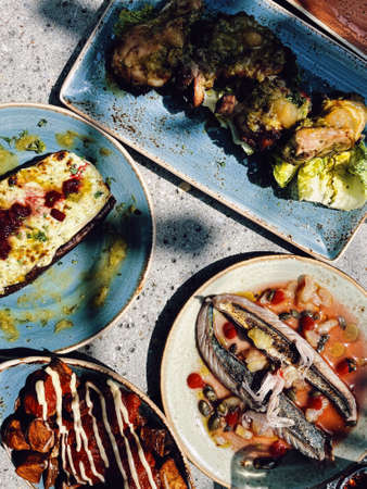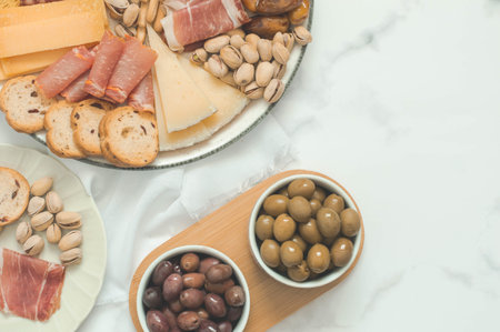 Topview of a table with tapas dishes. Mediterranean setting. International food.