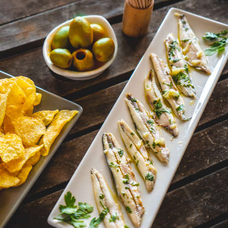 Three dishes with potato chips, picked anchovies and green olives on a dark wooden table with toothpicks. Typical Spanish snacks to eat in a bar.