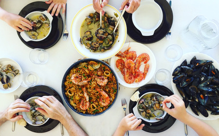 Family eating Paella and seafood. Top view