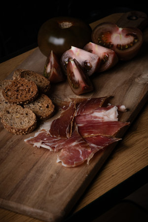Traditional Spanish Iberian Serrano Ham with tomato. Parma ham Italian antipasto