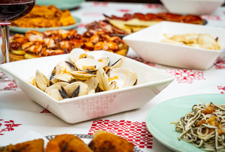 Close up on spanish food served on a restaurant table top.