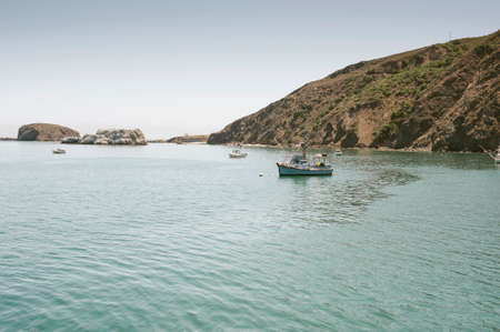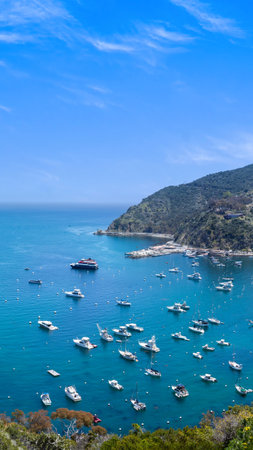 Boats at anchor on beautiful blue water of Santa Catalina Island California