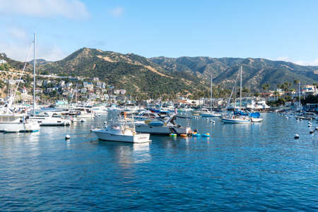 Avalon harbor in Santa Catalina Island with sailboats, fishing boats and yachts moored in calm bay, famous tourist attraction in Southern California, USA. June 20th, 2020