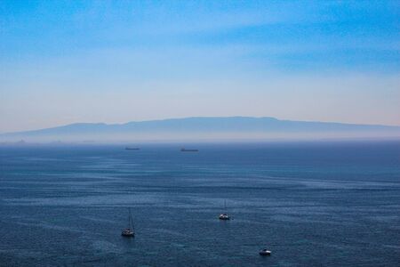 Seascape of calm azure sea, blue sky, no clouds. Distant island in haze with silhouettes of electric turbine windmills. Mediterranean sea, Greece.