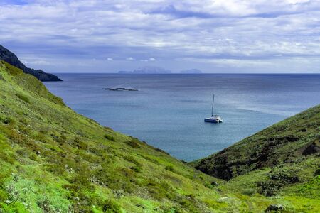 View of the bay and yacht at between cliffs at Ponta de Sao Lourenco, Madeira islands, Portugal