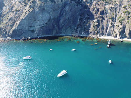 Blue water with yachts as a background from drone. Summer seascape.