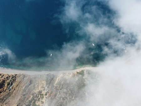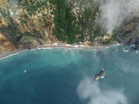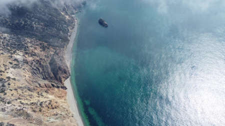 Aerial view from above on azure sea and rocky shores. Small waves on cristal clear water surface in motion blur. Nature summer ocean sea beach background. Nobody. Holiday, vacation and travel concept