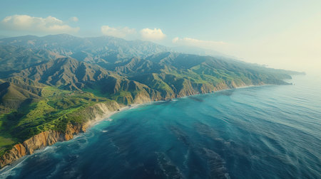 From above, a serene coastal landscape unfolds The vast ocean stretches out in an azure expanse, kissed by the horizon Majestic mountains rise in the distance, their peaks piercing the sky A tranquil shore, with its soft sands and gentle waves, completes this breathtaking scene captured in a masterful nature AI Generative