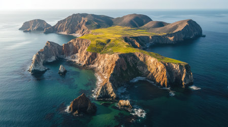 This aerial view showcases a dramatic island featuring steep cliffs and lush green hills, bordered by clear blue waters and calm waves, bathed in natural light.
