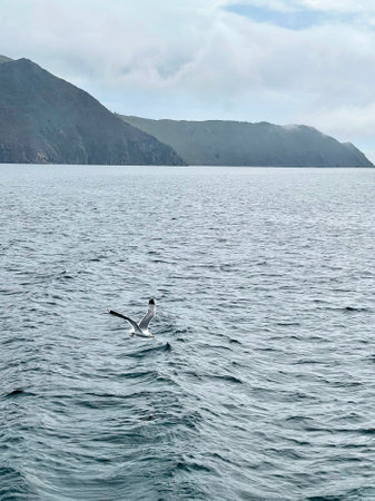 Seagull flying in the sky over Lake Baikal. Beautiful mountain landscape on a cloudy day.