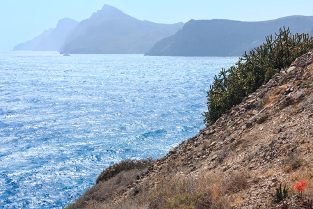 Mediterranean sea summer rocky coast view with blossoming cactus plant (Portman, Costa Blanca, Spain).