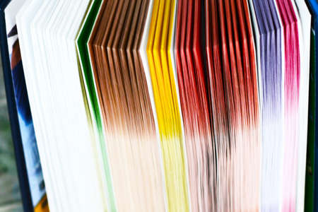 Stack of colorful magazines piled together on flat surface with blue background, representing reading, publication and media collection.