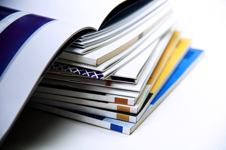 A layered arrangement of magazines with gently curling pages revealing vibrant prints, illuminated by delicate lighting for a refined artistic display.