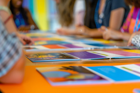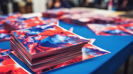 A vibrant scene showcasing a collection of magazines and brochures stacked on a creative workspace table, highlighting colorful prints and artistic designs.