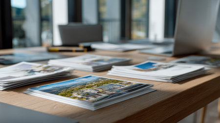 A stack of papers with pictures of buildings and a laptop on a wooden table. The papers are arranged in a neat stack, and the laptop is placed on the table. The scene suggests a work environment