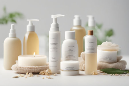 A variety of cosmetics and skin care products are displayed on a table, AI