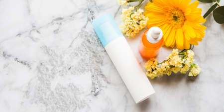 Skin care products - white pump dispenser and facial serum or essential oil in glass bottle on marble table with yellow flowers. Copy space, banner