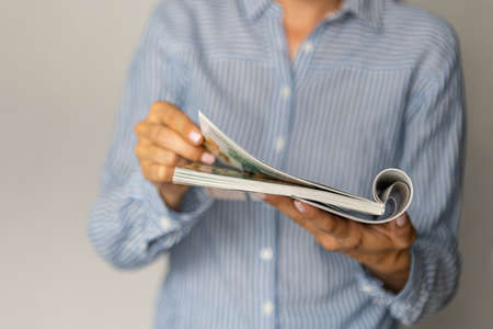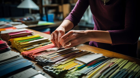 Close-up of editor's hands with printed pages colorful bookmarks focused lighting