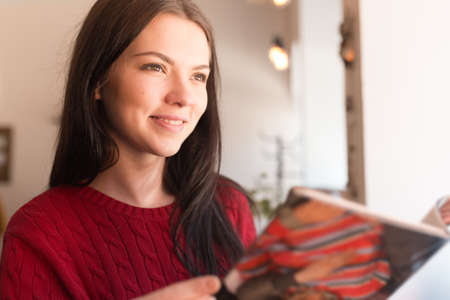 Charming beautiful smiling girl in eyeglasses reading book while sitting in cafe indoors