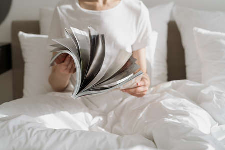 Person's hand flipping through magazine when lying in bed, morning rituals, people's lifestyle, home relax atmosphere, weekend in contemporary hotel room