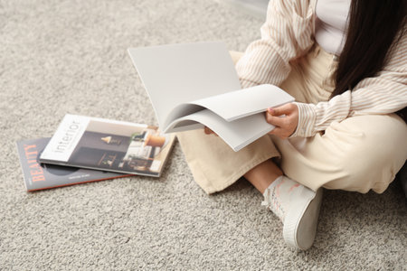 Beautiful female hands are holding an open book or magazine in a room on against a light wall