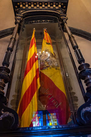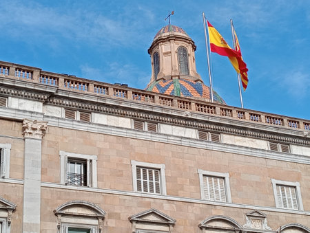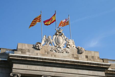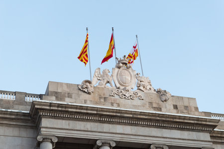 View of the flags of Barcelona, Catalonia and Spain flutter in the wind on the roof over the City Council of Barcelona. Barcelona is a popular tourist destination of Europeflutter in the wind on the roof over the City Council of Barcelona. Barcelona is a popular tourist destination of Europe