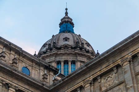 Barcelona, Catalonia, Spain - November 16, 2018: Worm's-eye view of the tholobate and the dome of the National Art Museum of Catalonia on the background of clear sky