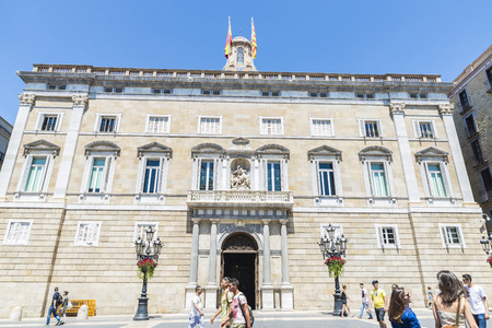 Barcelona,Spain - June 17, 2015: People walking in Sant Jaume square, in front of the facade of Generalitat of Catalonia