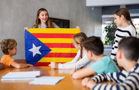 Young female teacher holding colorful flag of Estelada while working with preteens in classroom