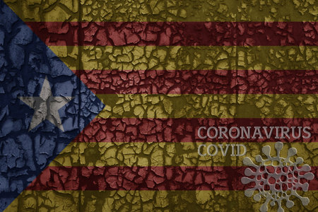 flag of catalonia on a old vintage metal rusty cracked wall with text coronavirus, covid, and virus picture.