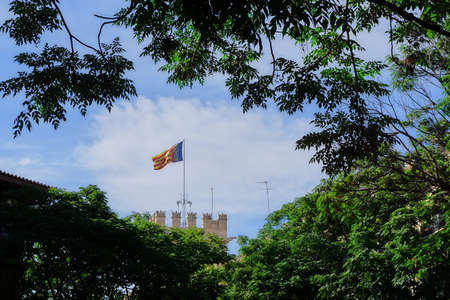 Spanish flag wawing on the top of La Lonja de la Seda in Valencia, Spain