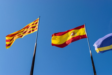 Flags of Spain and Catalonia. Shooting Location: Spain, Barcelona