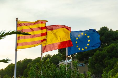 Flags of the EU European Union, Spain and Catalonia waving in sky