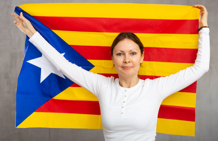 Happy smiling woman proudly displaying catalan flag