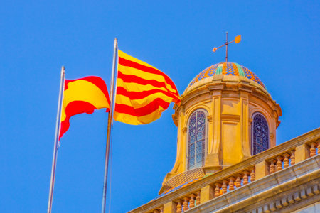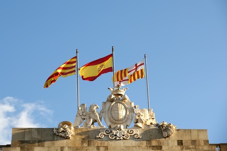 Flags of Barcelona, ​​Catalonia and Spain on the roof of Government House in Barcelona