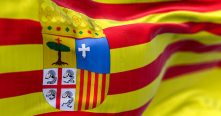 The Aragon flag waving. Aragon is an autonomous community in northeastern Spain. Selective focus. 3d illustration render. Close-up. Textured background