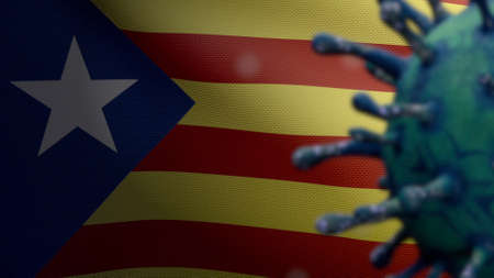 3D illustration coronavirus floating over Catalonia independent flag, pathogen attacks respiratory tract. Catalan estelada banner waving with pandemic Covid19 virus infection. Fabric texture ensign