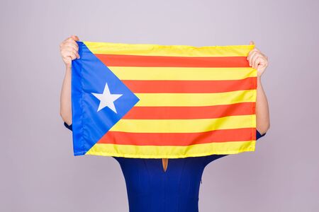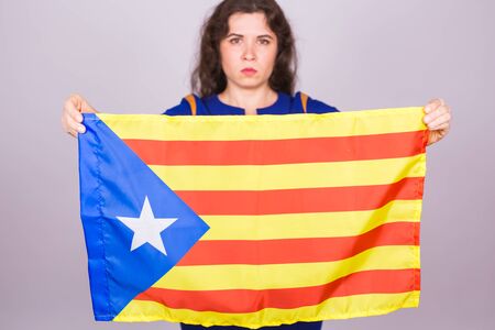 Portrait Of A serious catalan woman with estelada flag