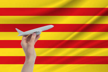 Airplane in hand with national flag of Catalonia. Travel to Catalonia.