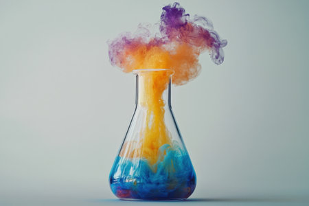 Colorful chemical reaction frozen mid-process in beaker with steam and bubbling liquid