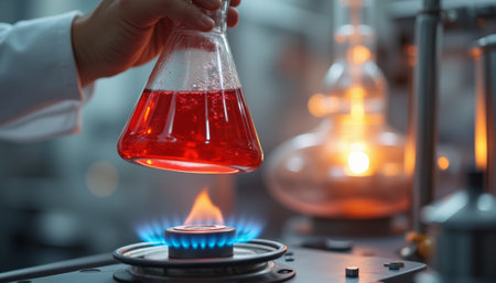Chemistry experiment setup with Bunsen burner heating a beaker of orange liquid