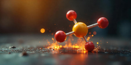 A vibrant molecular model with red and yellow atoms stands out against a dark background, illuminated by sparks, creating an energetic and dynamic atmosphere.