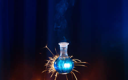 Laboratory glassware with blue liquid and smoke in the laboratory.