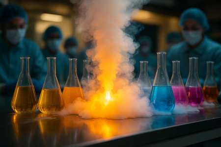 AI generated scientific experiment with vivid colored liquids glowing under intense heat and chemical reaction as scientists observe in high contrast laboratory atmosphere